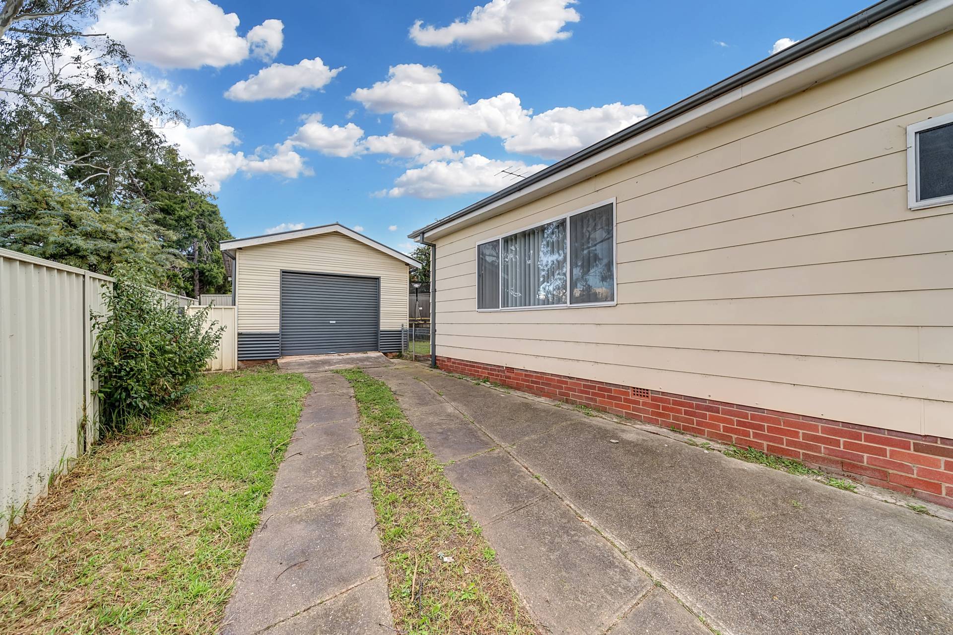 The backyard is low maintenance - made up mostly of grass and concrete. There’s an oversize single garage with plenty of room for a car and storage.