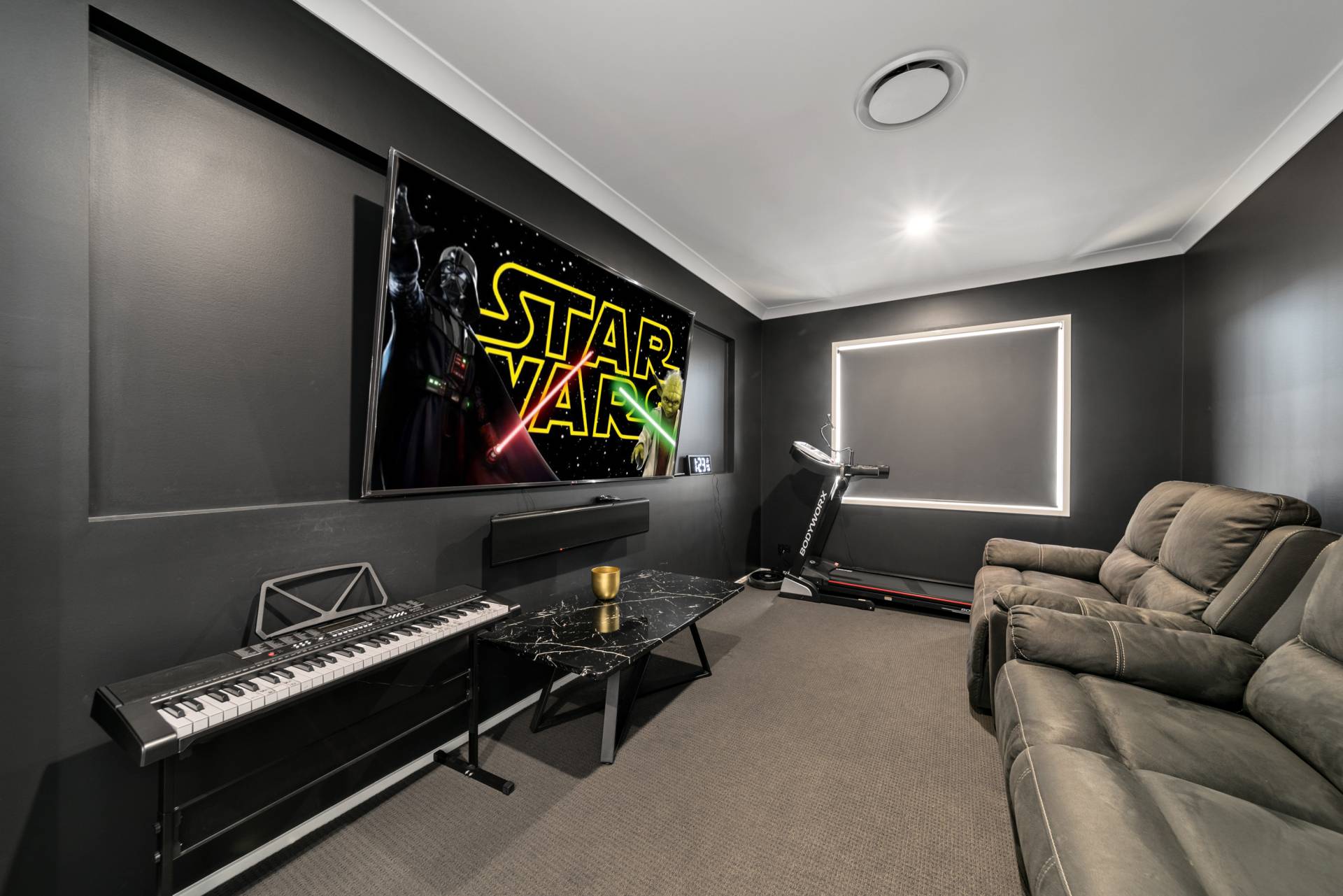 Make your way further into the house and you're coming up to the home theatre room. It is also fully soundproofed and has all the connections it necessary for a modern home theatre room!